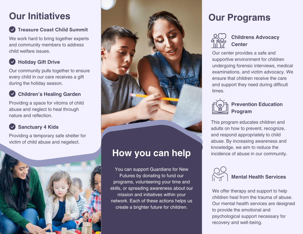 This brochure highlights the mission and programs of Guardians for New Futures, a nonprofit dedicated to supporting maltreated children and preventing child abuse. It details their key initiatives, such as the Children’s Advocacy Center, Prevention Education Program, and Mental Health Services, which provide comprehensive support and education. The brochure also outlines ways the community can contribute through donations, volunteering, and raising awareness.