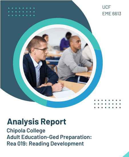 For this assignment, I conducted an analysis report for an adult education GED-preparation program at Chipola College. For this analysis report, I completed a goals analysis, a subordinate skills analysis, a learner analysis, a context analysis, and a Learning context analysis.